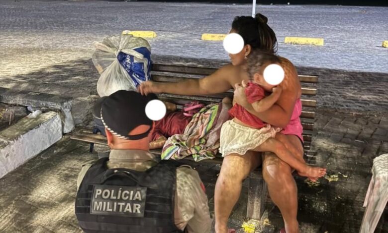 Segundo o chamado, feito por um cidadão identificado pelas iniciais A. B., uma mulher estaria no local acompanhada de duas crianças pequenas, com indícios de que permaneceria ao relento durante a madrugada. Ao chegar à orla, os policiais encontraram T. K. F. de S., de 27 anos, sentada em um banco em frente a um estabelecimento comercial, ao lado dos dois filhos menores.