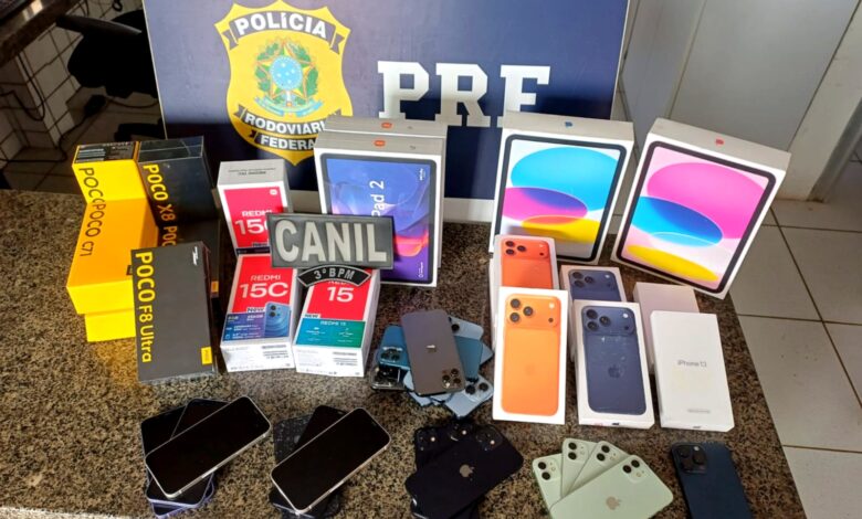 Entre os itens apreendidos, destacam-se dezenas de smartphones de diferentes marcas e modelos, incluindo aparelhos de alto valor de mercado, como iPhones de várias gerações, além de tablets e dispositivos de outras fabricantes. Parte dos celulares apresentava indícios de recondicionamento. Também foram recolhidos 34 pacotes contendo peças para manutenção de celulares, além de películas protetoras de tela e acessórios diversos.